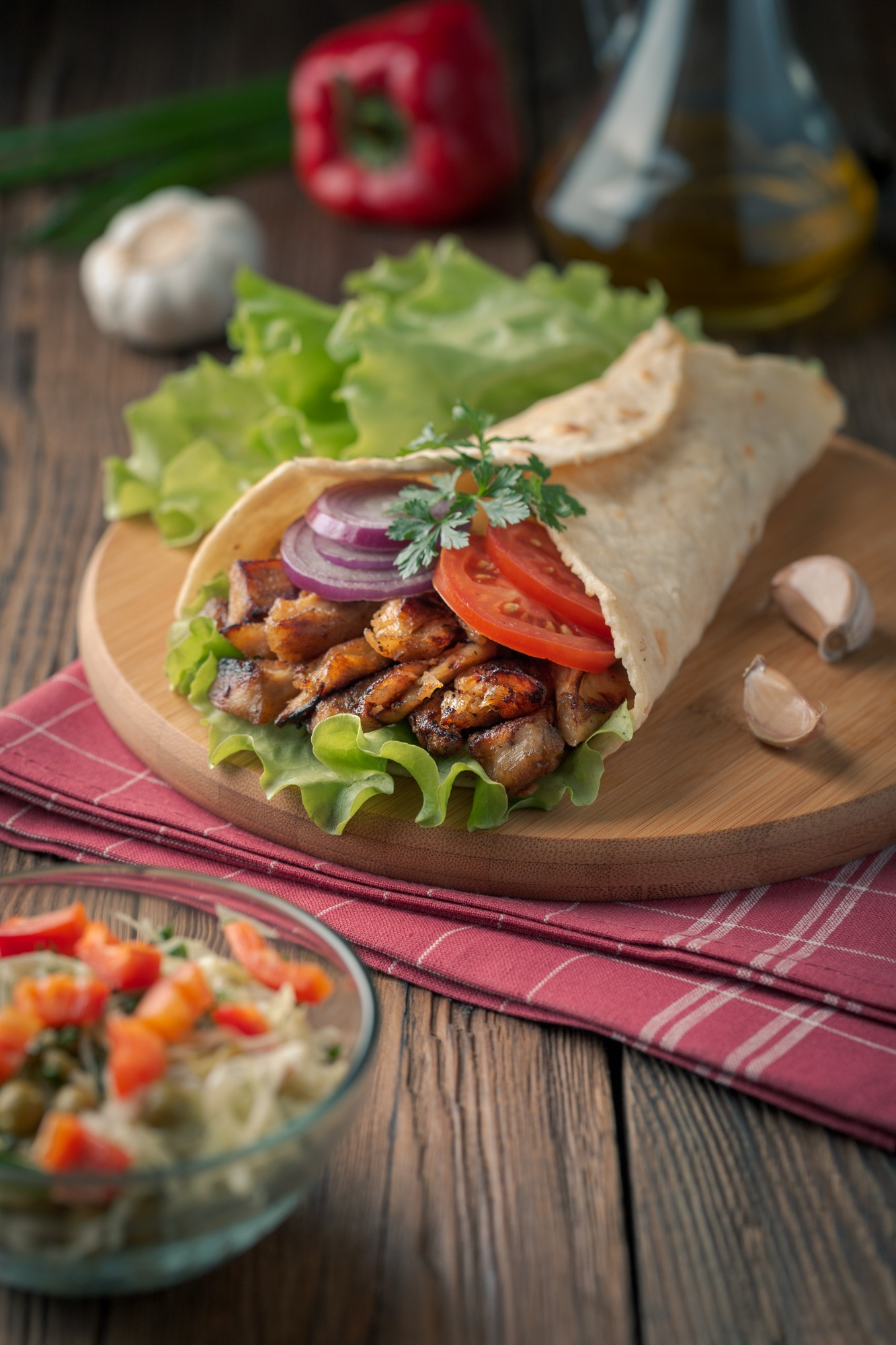 Mięso do wyboru, serek turecki z koperkiem, mi warzyw, chilli fresh + płatki chilli -